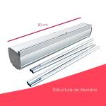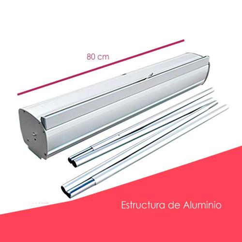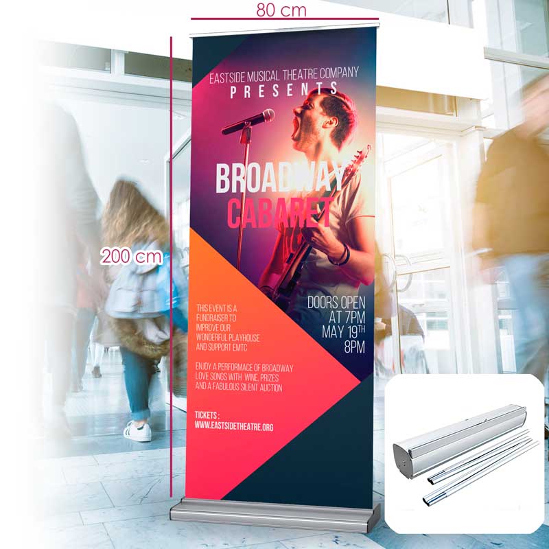 Roll Up de 80 cm de base x 200 cm de altura impreso con tela Sarga sublimada en alta resolución calidad fotográfica a 1440 dpis. La tela viene a 79x200 cm, con corte al ras perimetral con cauterizado para evitar el deshilado. Incluye tubo para sostener grafico, y estuche transportador de tela.