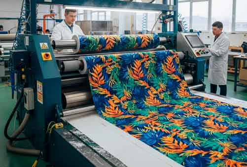 Fijación por Vapor (Vaporizado): Este es un proceso industrial avanzado, especialmente utilizado para colorantes reactivos y ácidos. El tejido estampado pasa a través de una gran cámara donde se inyecta vapor a condiciones controladas de temperatura y humedad. Las condiciones se ajustan con precisión: los colorantes reactivos sobre loneta de algodón requieren vapor saturado a temperaturas de 102-106°C, mientras que los colorantes dispersos sobre loneta de poliéster necesitan vapor sobrecalentado que puede alcanzar los 190°C.