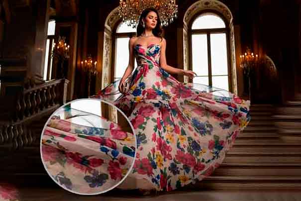 La clave de la chifon estampada o gasa shifonne es su comportamiento único reside en su proceso de fabricación, específicamente en el uso de hilos de alta torsión, comúnmente denominados hilos crepados.
